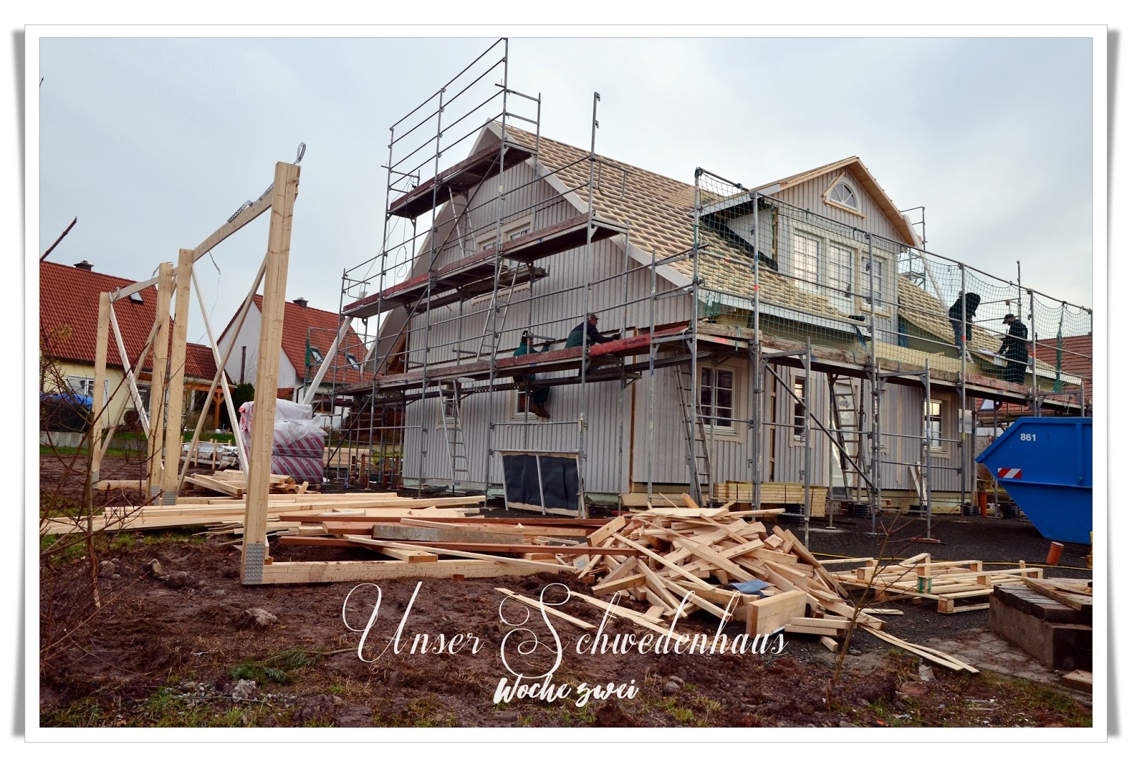 Am Donnerstag bekamen wir dann unsere richtigen Dachziegeln geliefert - falls sich jemand gewundert haben sollte, warum auf den Bildern bereits Dachziegeln vor dem Haus standen und nicht aufs Dach kamen: Das waren leider die falschen. Wir hatten uns ja bei der Bemusterung in Schweden zunächst für ziegelrote entschieden und diese ein paar Wochen später in weinrot geändert. Irgendwie ging das unter und so wurden die falsch gelieferten Ziegeln erst einmal vor dem Haus zwischengelagert und traten dann am Donnerstag - im Tausch gegen die richtigen Ziegeln - ihre Heimreise an.